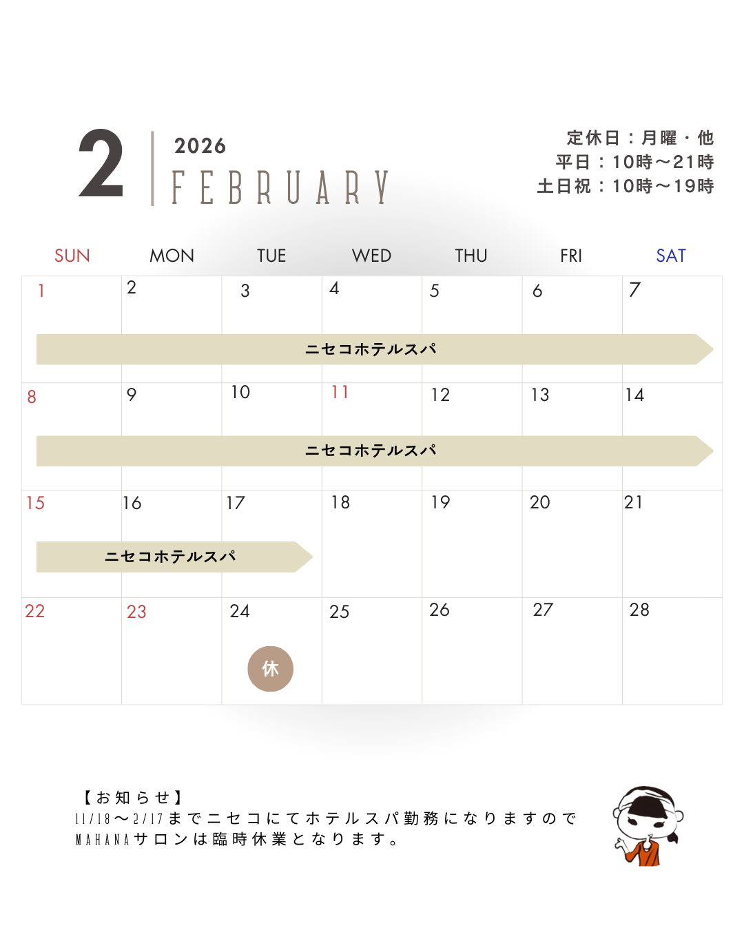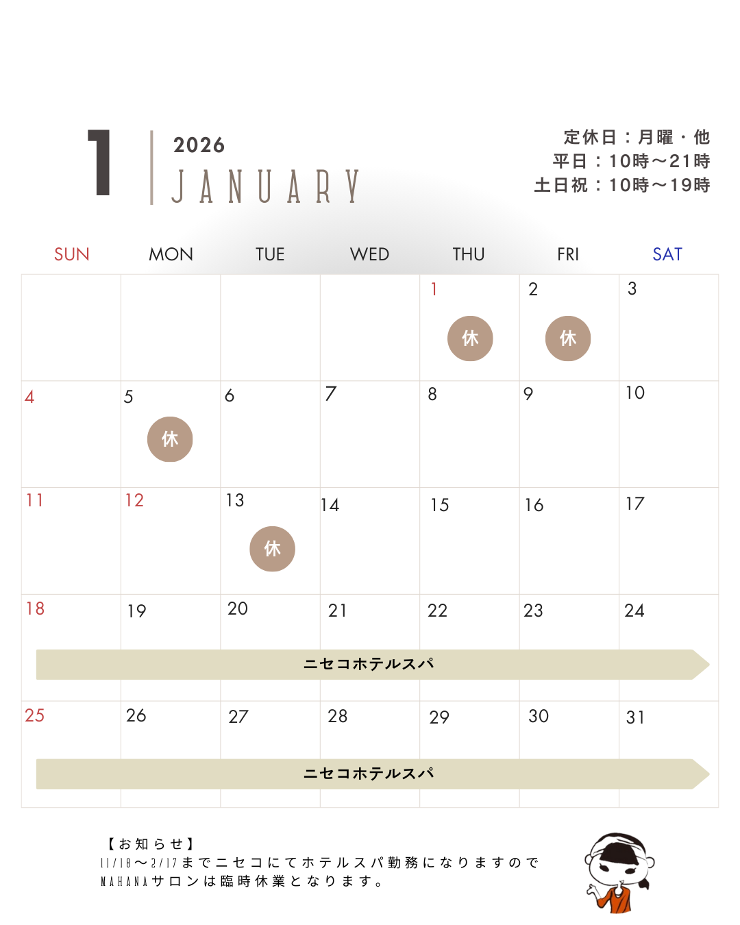 1/18~2/17の期間はニセコにてホテルスパ勤務になりますのでサロンは臨時休業となります。